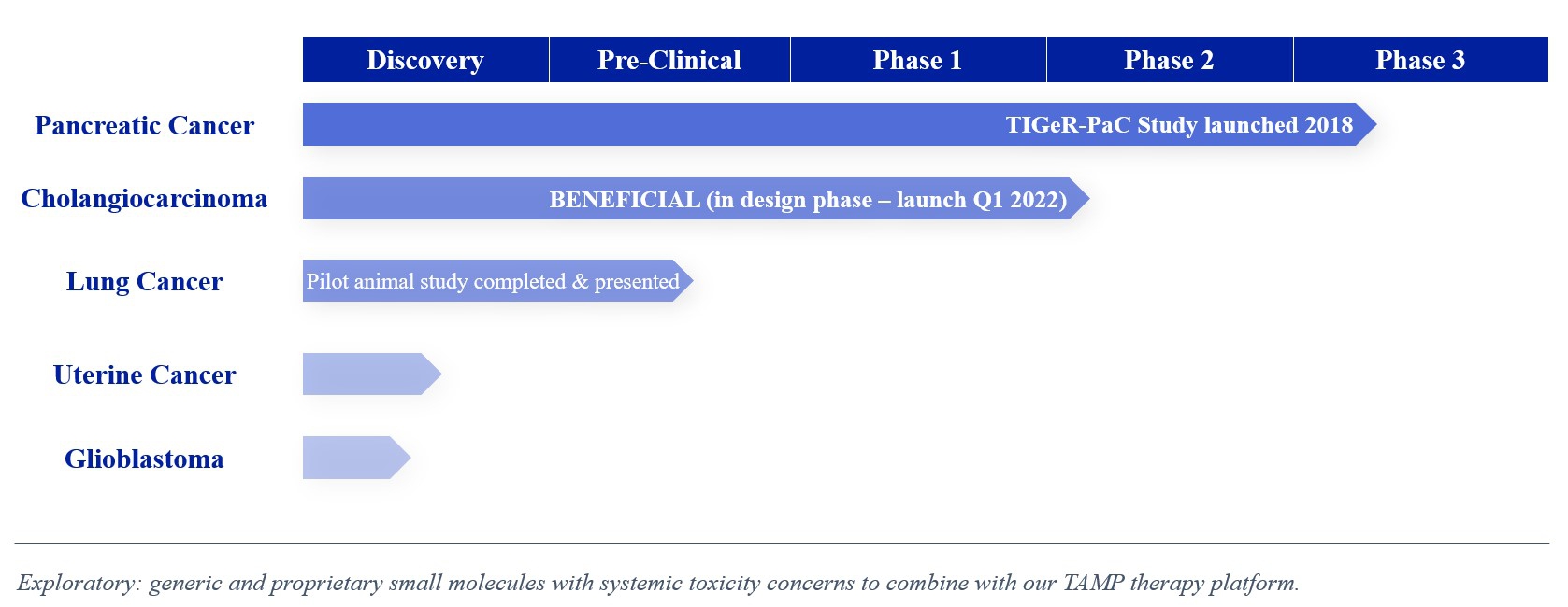 We intend to submit our proposed Phase 2/3 clinical trial to evaluate RenovoGem in HCCA, BENEFICIAL, to the FDA as part of a pre-IND submission in the second or third quarter of 2021 and to launch the clinical trial in the first half of 2022. Intra-venous (IV), or systemic, delivery of gemcitabine has been considered standard of care for several solid tumors, and the drug’s anti-cancer tumor effects are well profiled. We intend to explore the application of our RenovoTAMP platform in additional indications including locally advanced lung cancer, locally advanced uterine cancer, and glioblastoma. We have completed and presented data on a lung cancer application in pre-clinical studies, and additional pre-clinical experiments in lung cancer may be conducted. Beyond our initial anti-cancer product candidate, RenovoGem, multiple small molecule therapeutics could be incorporated into our RenovoTAMP platform, and we will opportunistically look to develop other potential product candidates.