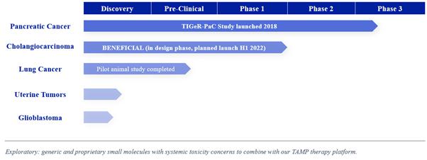 We intend to submit our proposed Phase 2/3 clinical trial to evaluate RenovoGem in HCCA, BENEFICIAL, to the FDA as part of a pre-IND submission in the fourth quarter of 2021 and to launch the clinical trial in the first half of 2022. Intra-venous (IV), or systemic, delivery of gemcitabine has been considered standard of care for several solid tumors, and the drug’s anti-cancer tumor effects are well profiled. We intend to explore the application of our RenovoTAMP platform in additional indications including locally advanced lung cancer, locally advanced uterine cancer, and glioblastoma. We have completed and presented data on a lung cancer application in pre-clinical studies, and additional pre-clinical experiments in lung cancer may be conducted. Beyond our initial anti-cancer product candidate, RenovoGem, multiple small molecule therapeutics could be incorporated into our RenovoTAMP platform, and we will opportunistically look to develop other potential product candidates.