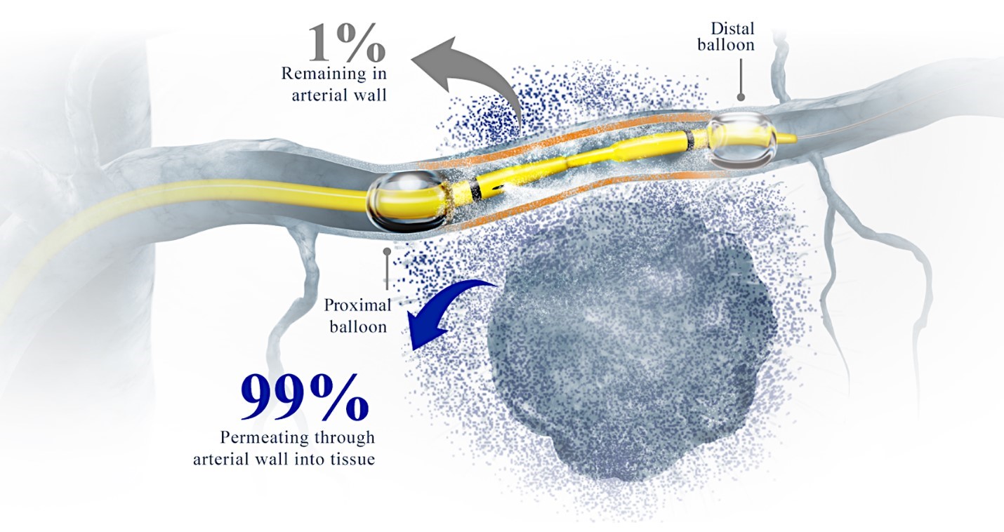 While the field of oncology has seen progress in treating a handful of deadly cancers over the last few decades, there is a common limitation in chemotherapy: enhanced dosing of the drug to impact the tumor while minimizing systemic toxicity. The characteristics of the vasculature, within and surrounding the tumor, can be a limiting step in this goal. For example, LAPC and HCCA are more difficult to treat due to the lack of blood vessels that feed these tumors, making it difficult to expose tumors to chemotherapy, which is typically delivered intravenously. Trans-arterial chemoembolization (TACE) is an established first line therapy for certain solid tumors. A key component of this approach is to identify and isolate vessels feeding the tumor, known as tumor feeders. However, in patients with pancreatic cancer, no tumor feeder vessels are visible during angiography. In the absence of visible tumor feeders, we can introduce drugs directly across the arterial wall into the surrounding tissue via pressurized diffusion.
