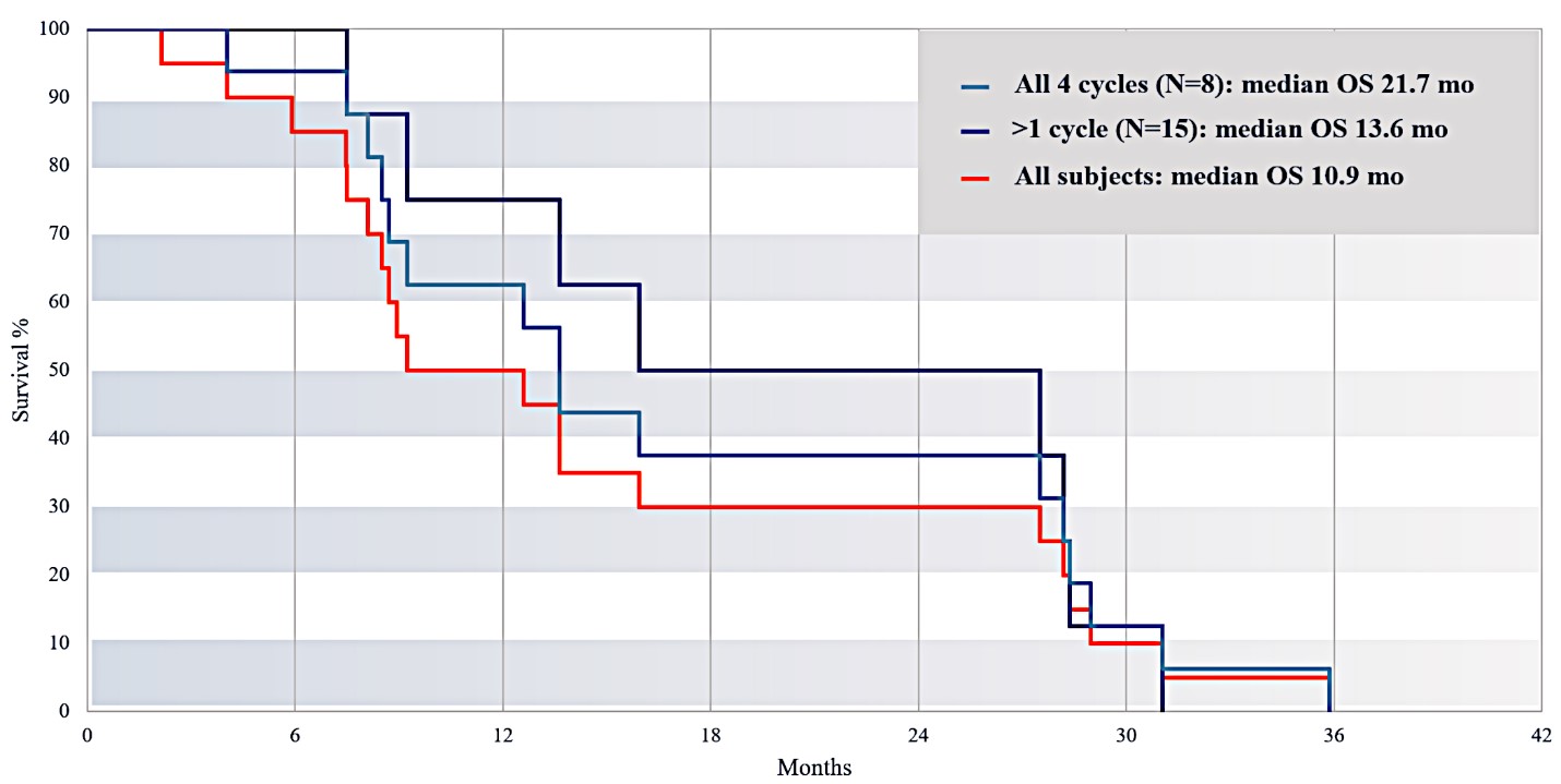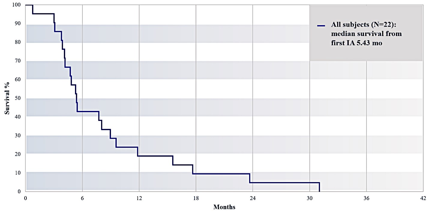 For our initial indication, LAPC, we have completed two studies. We launched RR1, our first-in-human, dose escalation, Phase 1/2 safety study in May 2015 to evaluate our RenovoTAMP platform by delivering intra-arterial gemcitabine via our patented RenovoCath delivery system. In this safety study, 20 patients with a diagnosis of Stage 3 pancreatic cancer were enrolled. We established the maximum tolerated dose of 1000mg/m2 of intra-arterial gemcitabine delivered via RenovoCath. The most common serious adverse events were neutropenia followed by sepsis. After completion of enrollment and demonstration of an early survival efficacy signal in this study, we launched our RR2 observational registry study in June 2016. The key inclusion criteria was a diagnosis of advanced or borderline resectable pancreatic adenocarcinoma confirmed by histology or cytology. The primary endpoints were survival, tumor response and performance of RenovoCath. A combination analysis of these two studies demonstrated that survival in “all comers” (n=31) receiving at least one cycle (two treatments over one month) was 29% at two years. Looking at the prior-radiation therapy subset (n=10), 24-month survival was 60% with a median overall survival (mOS) of 27.9 months. This compares favorably both to IV chemotherapy alone, with 24-month survival of 12%, and to chemotherapy + radiation with 24-month survival of 5% and mOS of 12-15 months as demonstrated in historical studies.