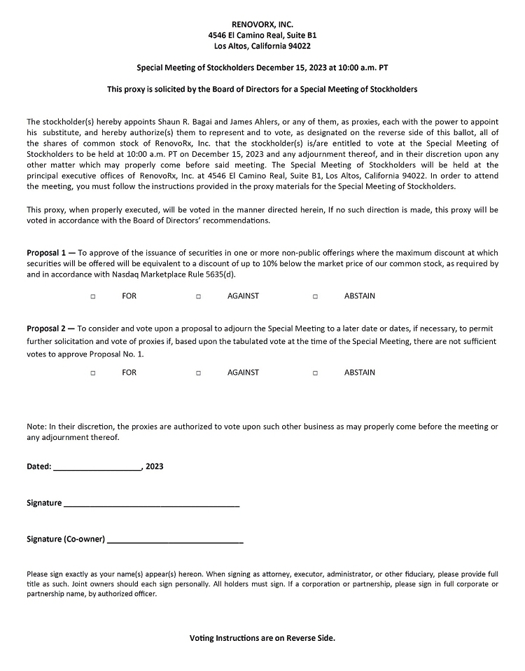 You are invited to attend a Special Meeting of Stockholders (the “Special Meeting”) of RenovoRx, Inc. (“Renovo” “the Company” “we” “us” or “our”), which will be held on December 15, 2023 at 10:00 a.m., Pacific Time, at the Company’s principal executive offices at 4546 El Camino Real Suite B1, Los Altos, California, for the following purposes: