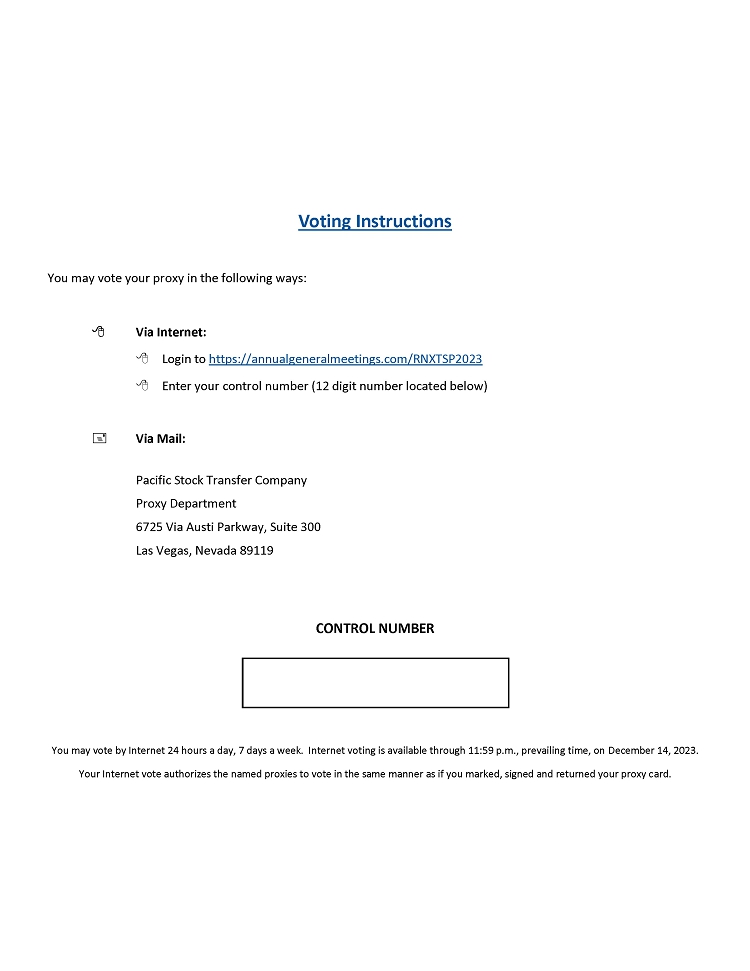 It is anticipated the attached proxy statement and the enclosed proxy card will first be mailed on or about November 28, 2023 to stockholders entitled to vote as of the close of business on the Record Date. These proxy materials contain instructions on how to access this proxy statement online at: https://annualgeneralmeetings.com/rnxtsp2023, and how to submit your proxy to vote via the internet or mail.